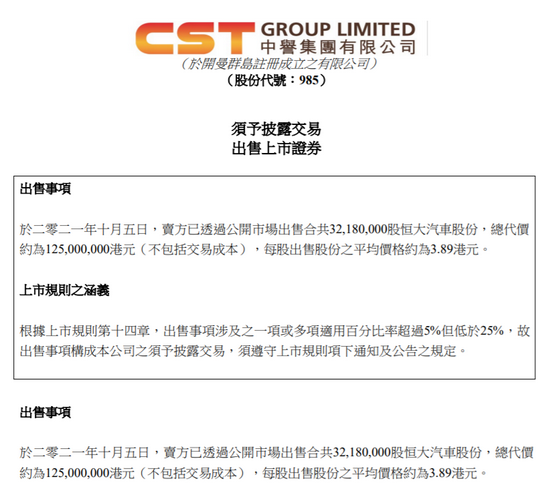 10月6日消息,中誉集团发布公告,公司在10月5日已通过公开市场出售3218万股恒大汽车股份,每股均价3.89港元,总代价1.25亿港元。