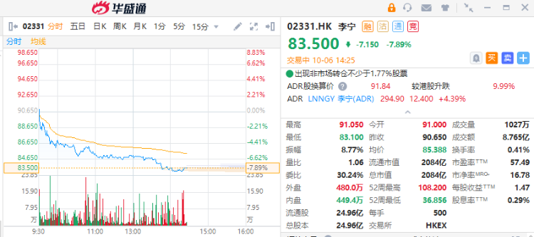 华盛资讯10月6日消息,港股午后体育用品股跌幅继续扩大,截止发稿,李宁(02331.HK)跌近8%,特步国际(01368.HK)跌近7%,安踏体育(02020.HK)跌超5%,波司登(03998.HK)跌近5%。