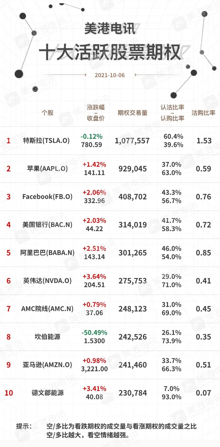 隔夜美股十大活跃股票期权概况一览。特斯拉(TSLA)期权交易量从上一交易日的84.7万张升至108万张,空/多比从0.73升至1.53,看空情绪增强。