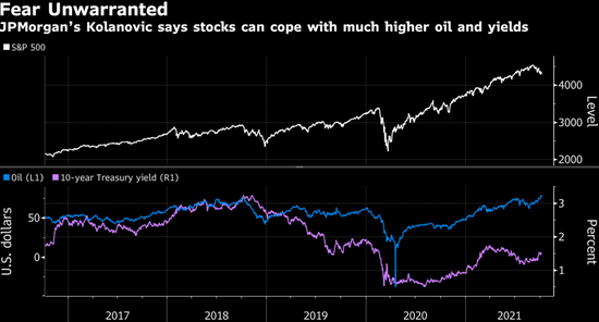 “除非(美国10年期)收益率升至250-300个基点以上,否则我们预计股市不会广泛下跌,而我们预计短期内收益率不会涨这么多,”Kolanovic及其同事在周三客户报告中写道。“我们并不认为当前能源价格会对经济产生重大负面影响。”