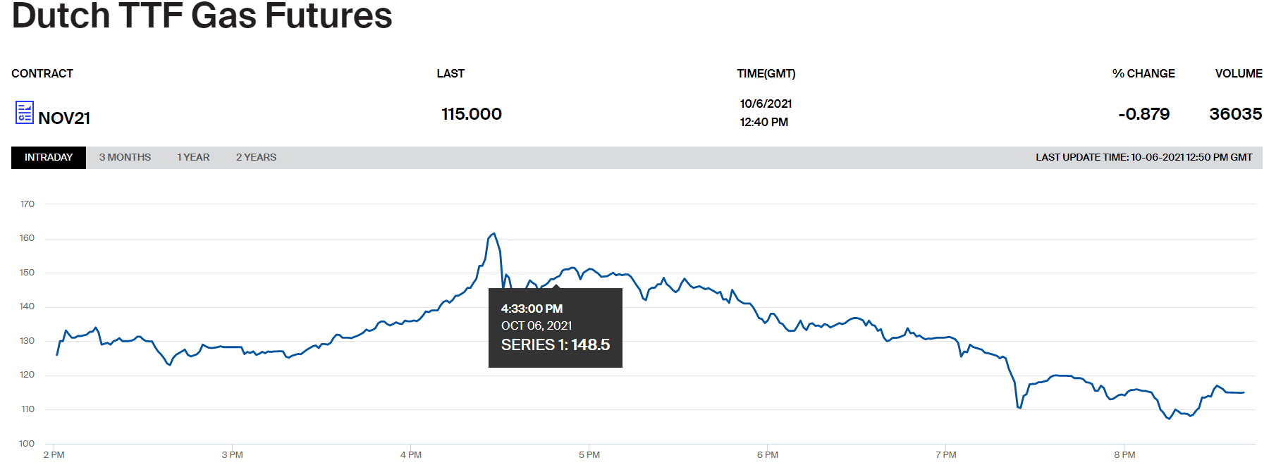 截止发稿,荷兰TTF天然气11月份合约跌约0.88%,报约115欧元/兆瓦时,盘中该合约一度大涨超20%。