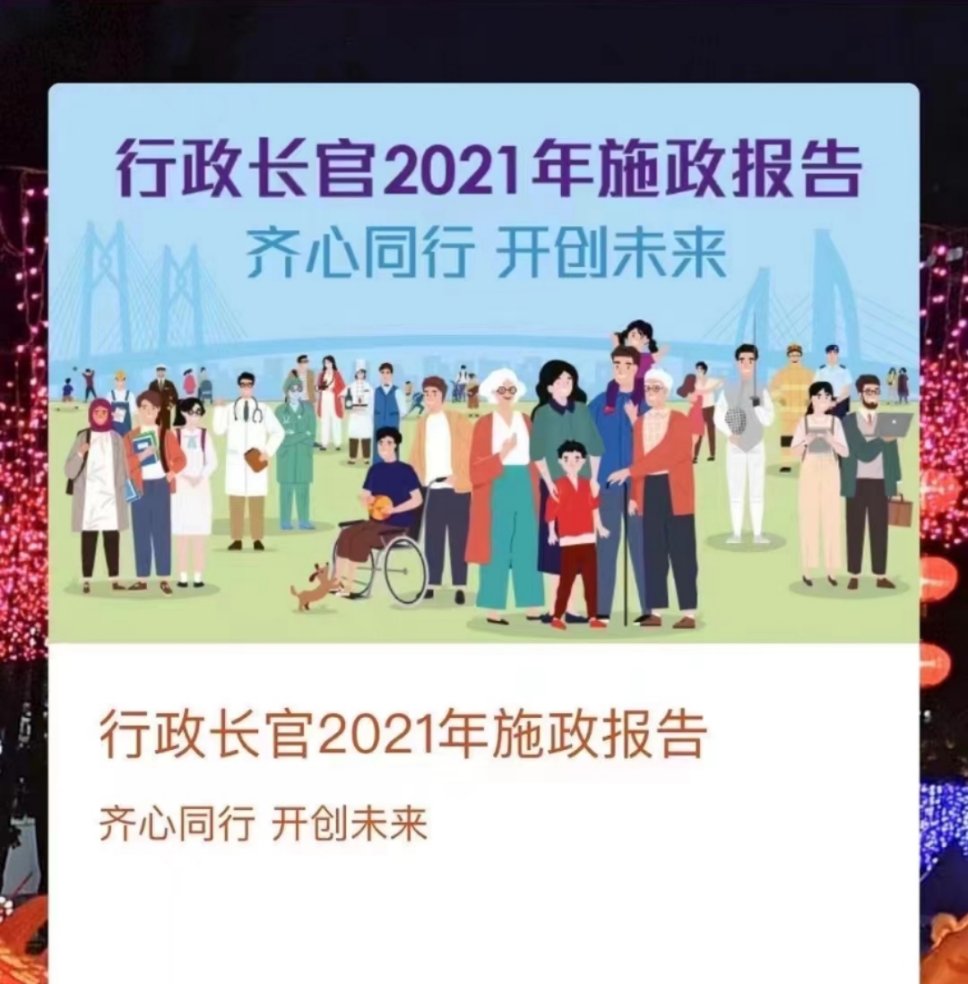 2021年香港《施政报告》以“齐心同行 开创未来”为题。林郑月娥提到,香港过去两年经历前所未有的严峻挑战,在中央政府的全力支持下,现已回到“一国两制”的正确轨道。在《十四五规划纲要》、《粤港澳大湾区发展规划纲要》和《全面深化前海深港现代服务业合作区改革开放方案》之下,香港企业和专业服务提供者享有无限机遇;香港只要用好中央支持特区的政策,发挥独特优势,将可为经济注入源源不绝的动力。