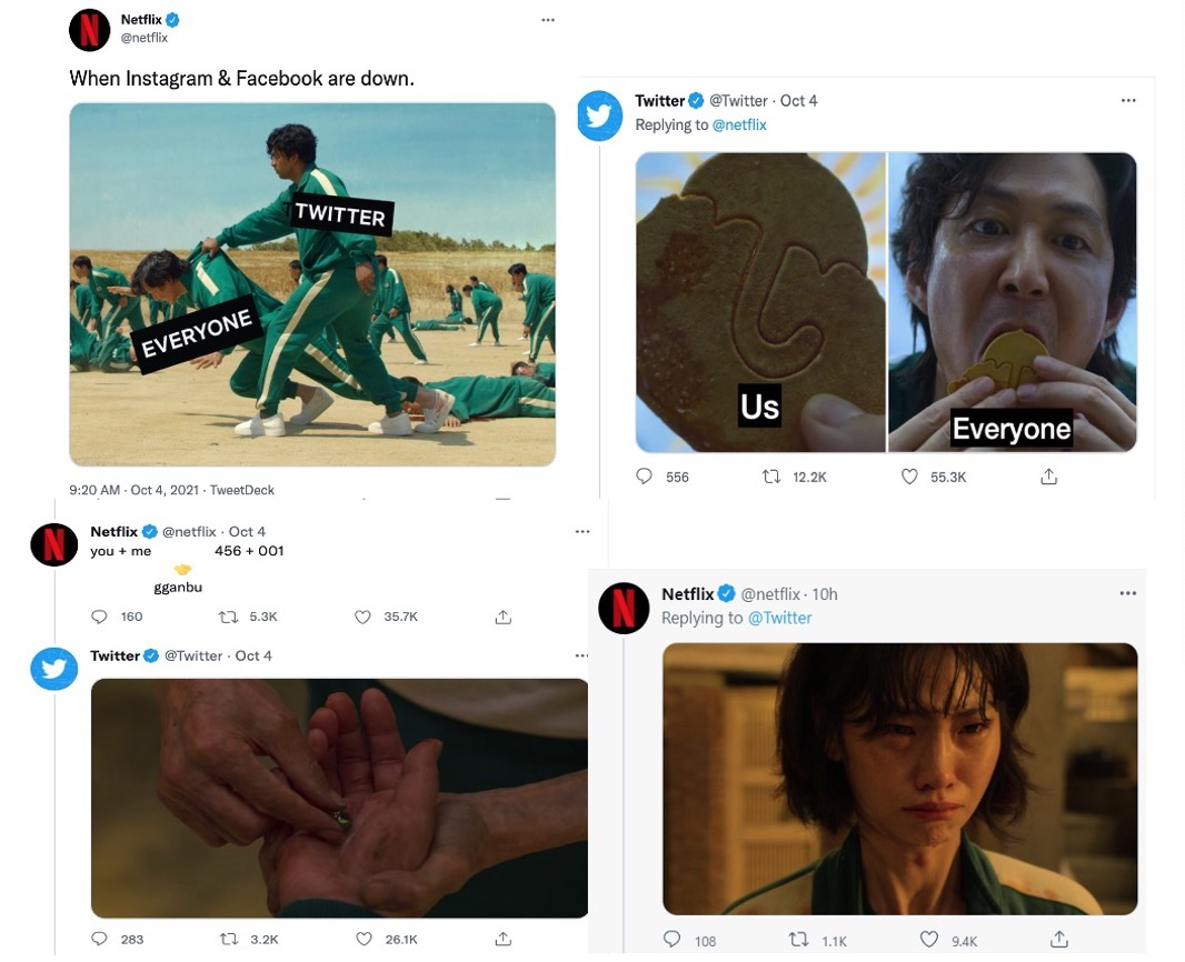 比如在本周一的Facebook大宕机事件中,Netflix和Twitter两家就用《鱿鱼游戏》给玩上了:先是Netflix官方账号用木头人中经典一幕把Twitter“彩虹”了一番,Twitter官方号也不客气,用椪糖游戏来傲娇影射自己在Facebook消失的一天里有多么的受追捧,接着Netflix用001+465的钢布之情“告白”Twitter,Twitter送了一颗弹珠给Netflix…