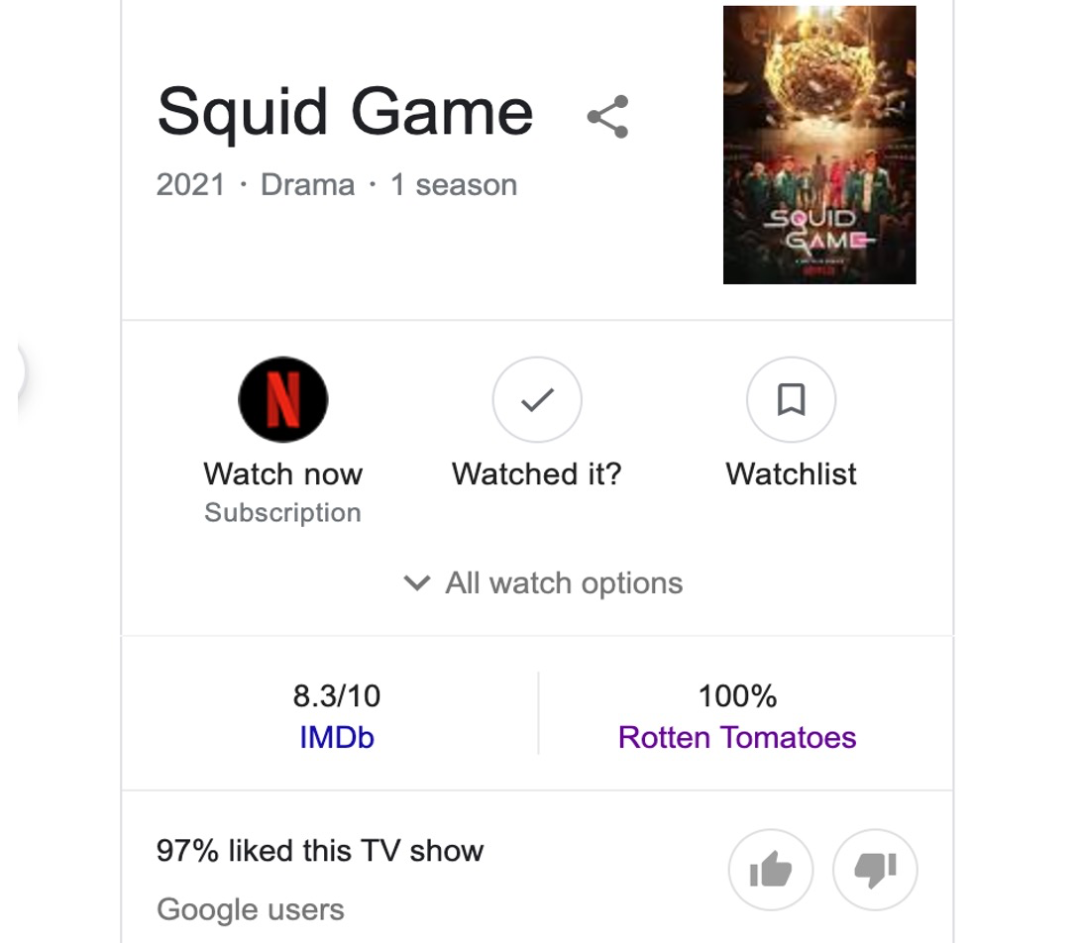 作为一部与Netflix合拍的韩国剧集,《鱿鱼游戏》目前已经成功冲破了亚洲圈,影响力席卷欧美,获得了烂番茄平台100%、谷歌97%用户的推荐,跻身近年来Netflix出产的全球影响力最大的非英语类剧集之一。