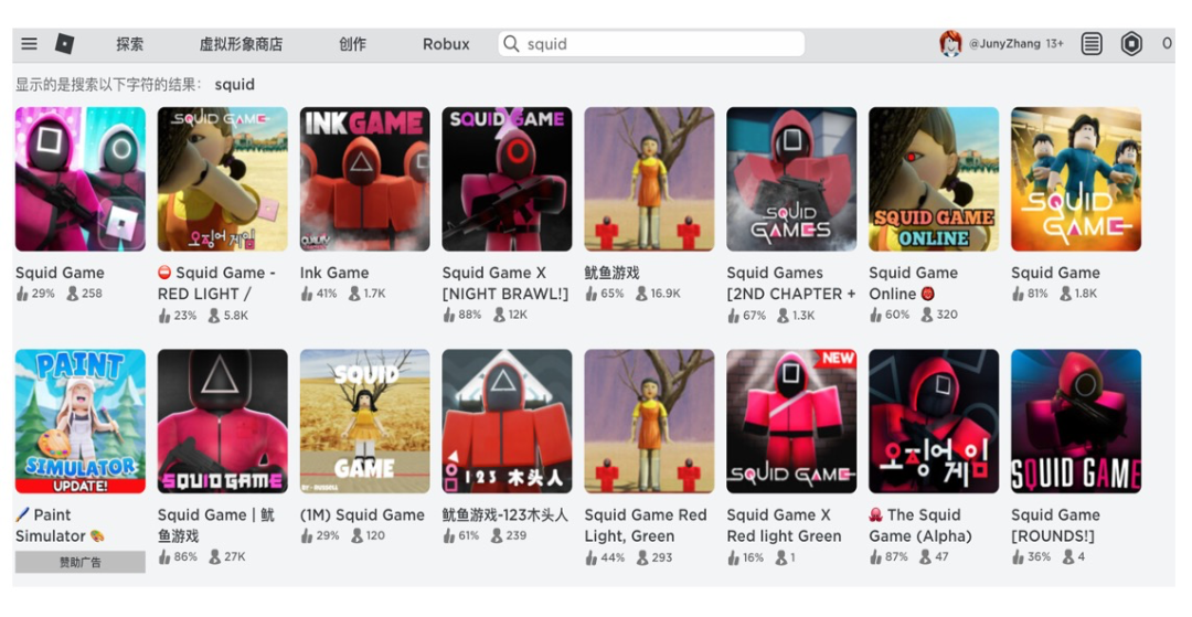现在,当你在Roblox平台上搜索“Squid Game”或“Fish Game”时,会出来很多与《鱿鱼游戏》相关的创作。游戏设定都大同小异,大家可以选择好评率高的进就可以。在这里,我们以最早开发、好评最高的一款(Hexa Game,开发者@princeelf)为例来给大家介绍。