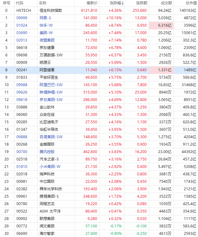 其中,网易涨10.16%,股价报141港元;快手涨8.74%;美团涨7.44%;微盟集团涨7.14%;Saas概念股万国数据、明源云涨逾6%;阿里巴巴、平安好医生、京东集团等涨逾5%;百度、腾讯、小米跟涨。