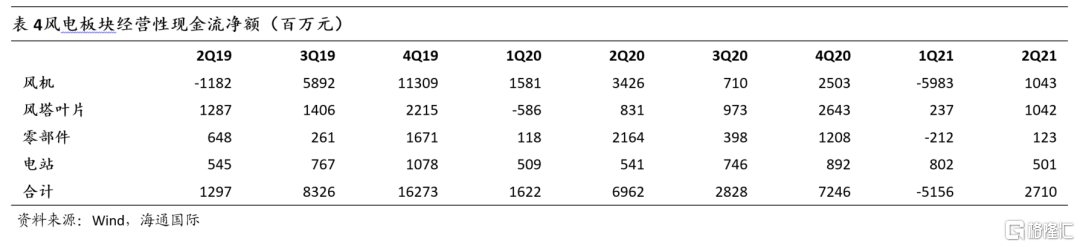 21Q2风电板块单季度经营性现金流净额为27.1亿元,同比下降,主要是风机、零部件板块经营性现金流净额同比大幅下降。