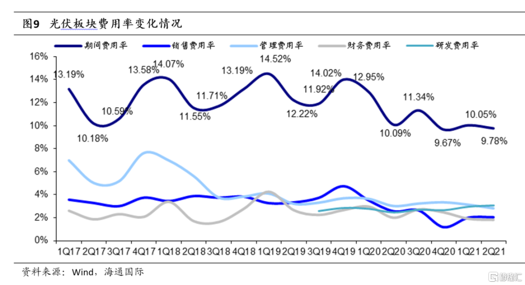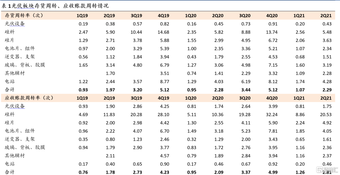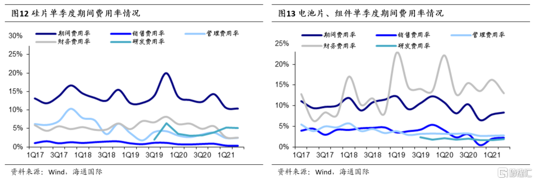 分子板块来看,21Q2期间费用率最高的是电站板块,达到19.37%,主要是财务费用率明显高于其他子板块;硅料环节21Q2期间费用率为7.81%,是各板块中最低的。