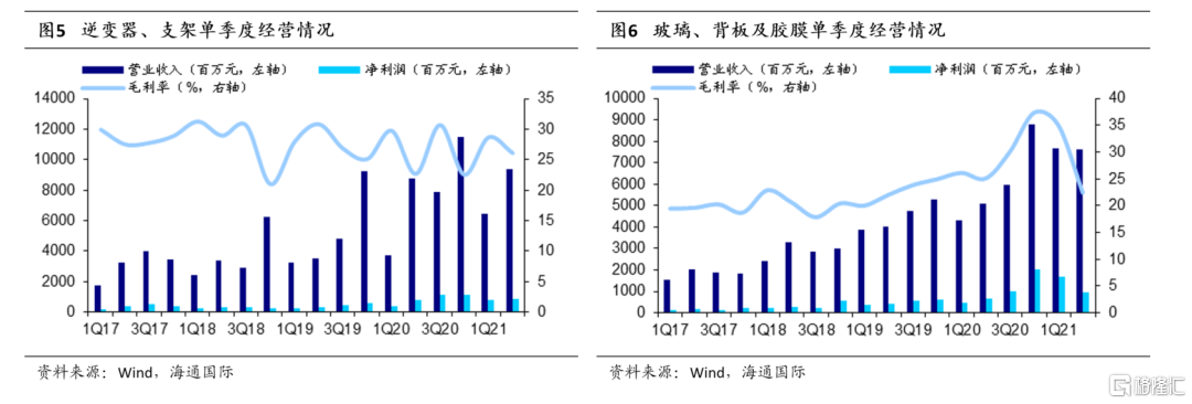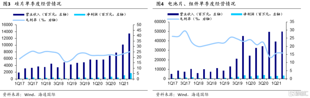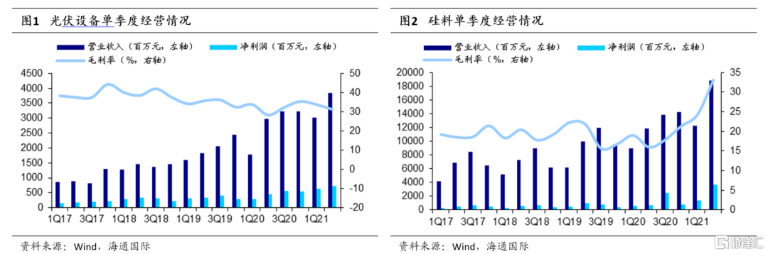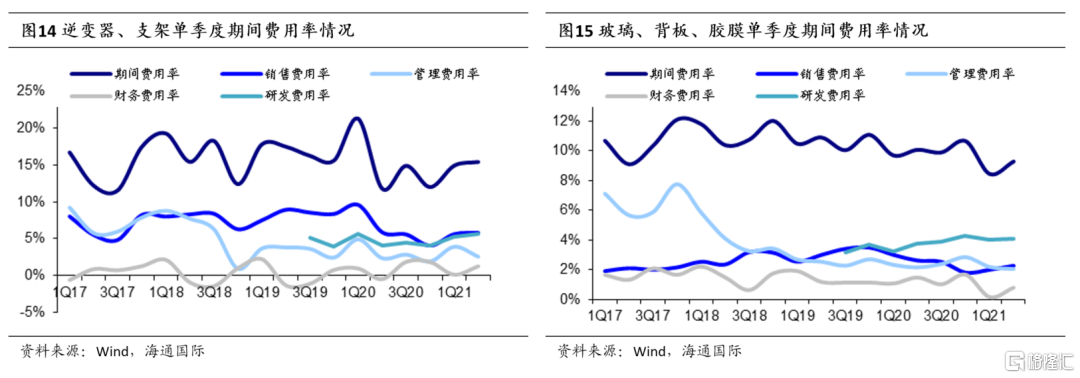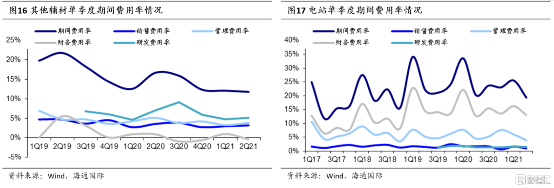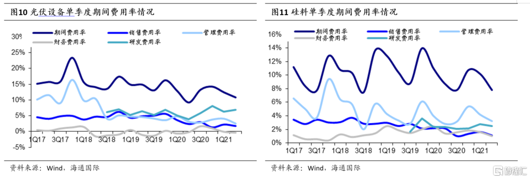 从单季度的变化趋势来看:光伏设备环节21Q2毛利率为31.14%%,相对20Q2同比上升;硅料环节21Q2毛利率33.06%,环比继续大幅上升8.83%百分点,电池片、组件环节毛利率15.89%,环比基本持平,同比下降5.06个百分点,我们认为主要源于硅料大幅上涨背景下,中游制造环节承压;玻璃、背板及胶膜环节21Q2毛利率为22.43%,环比下降12.55个百分点,我们认为主要是终端装机不及预期,玻璃、胶膜价格下降所致;电站环节21Q2毛利率环比有较大提升。