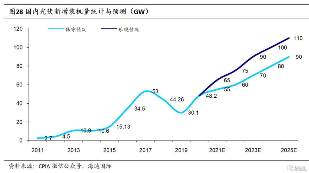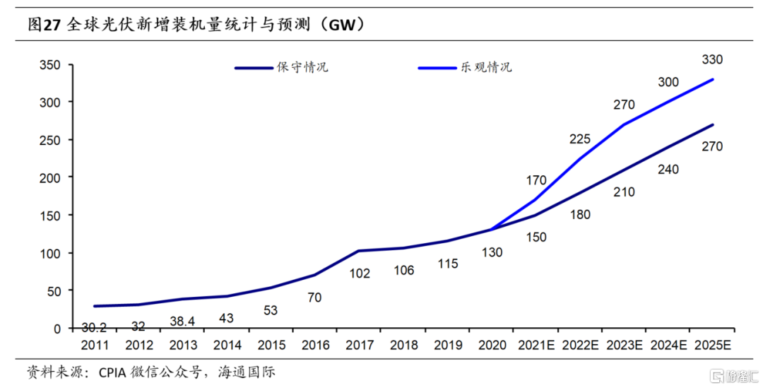 根据中国光伏行业协会CPIA统计,2020年全球光伏新增装机量约为130GW;CPIA预计2021年全球光伏新增装机量约为150-170GW,同比增长15%-31%;CPIA同时预计至2025年,全球光伏新增装机量有望达到270-330GW,5年时间内行业需求有望持续稳定增长。