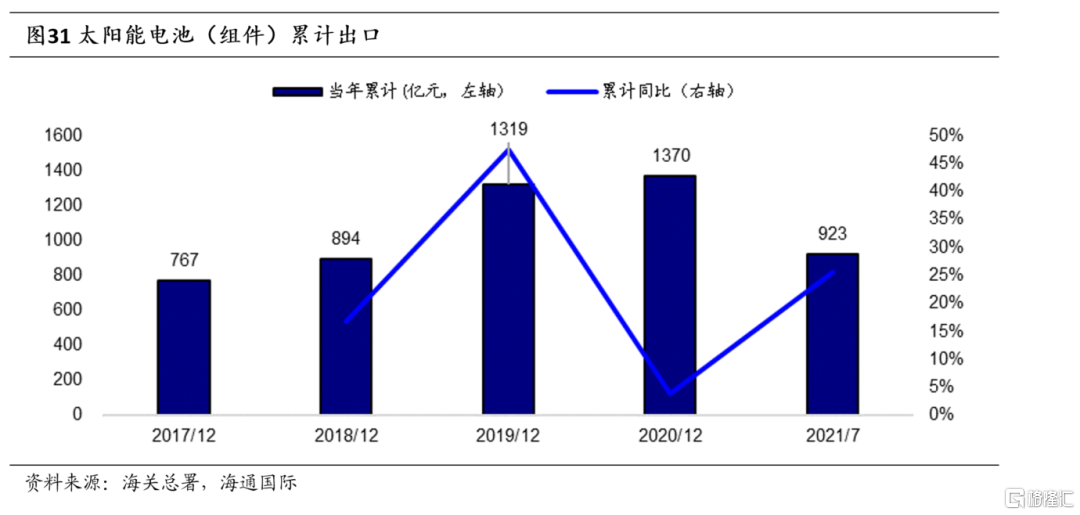根据海关总署数据,1-7月国内太阳能电池(组件)累计出口922.8亿元,同比增25.6%,7月单月出口138.24亿元,同比增20.1%。我们认为,出口保持稳定增速,证明海外需求具备韧性,预计下半年依然将保持稳定增长。