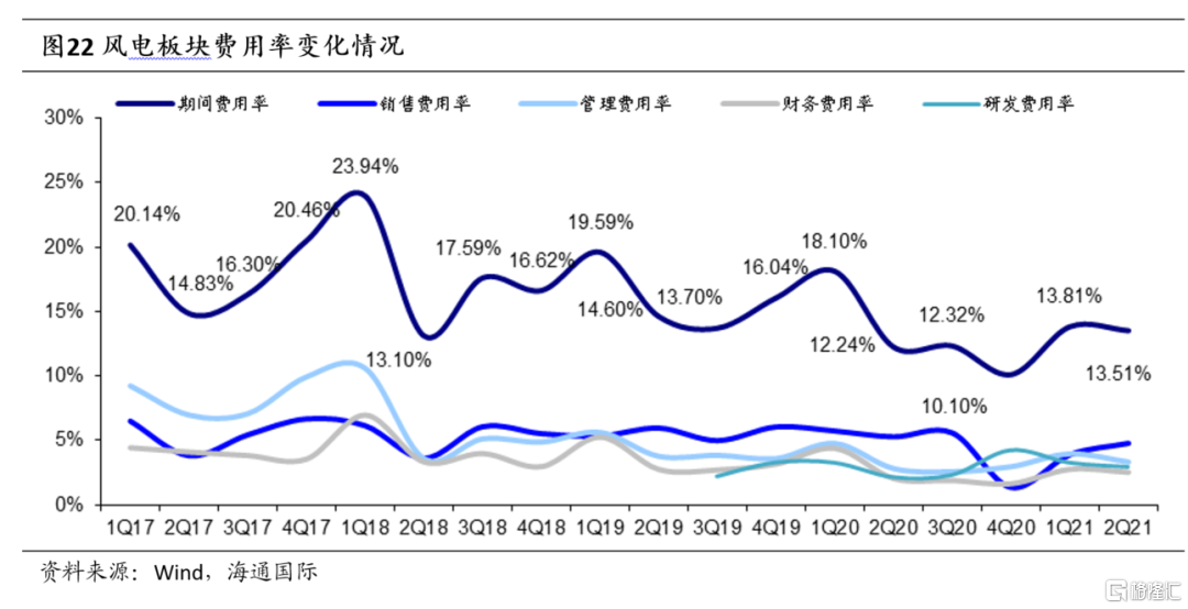 21Q2风电行业期间费用率为13.51%,同比上升1.27个百分点、环比下降0.3个百分点。其中除销售费用率同比下降之外,管理、财务和研发费用率同比均有上升。