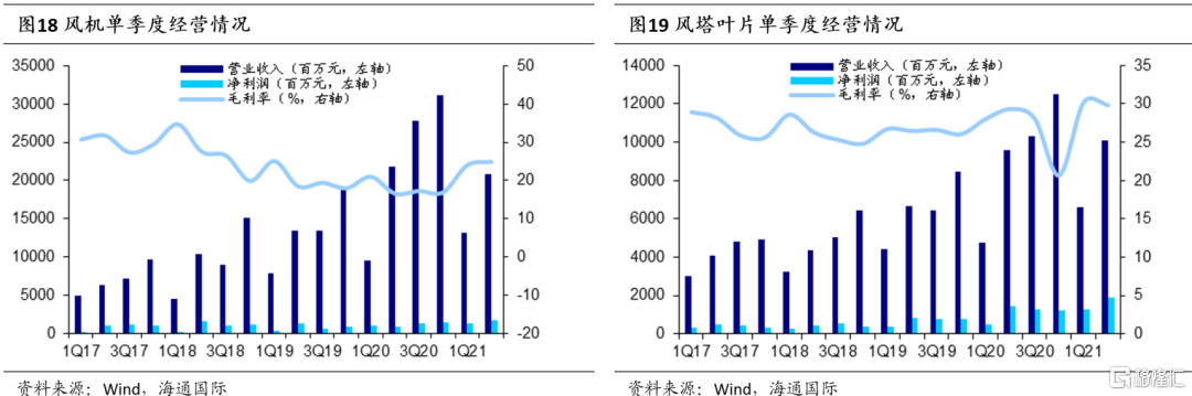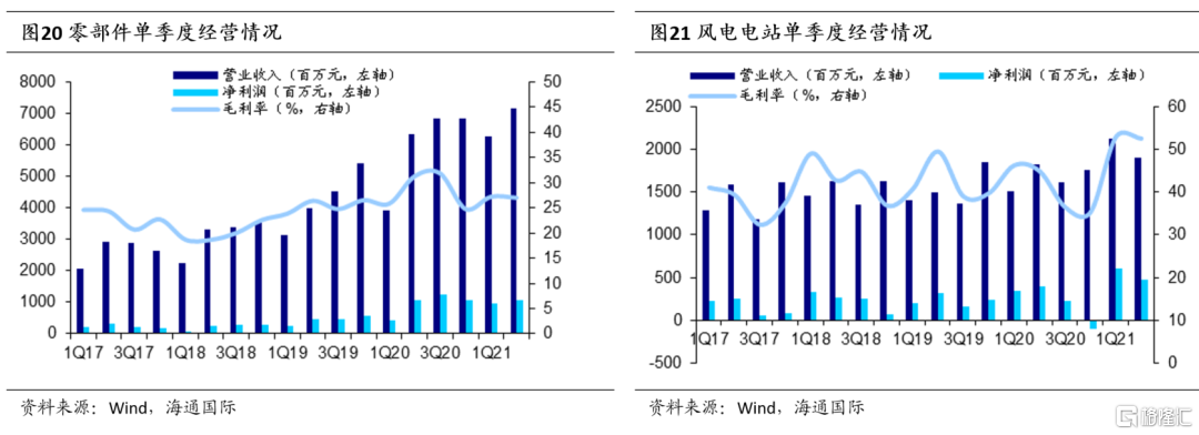 综合来看:2021年上半年及21Q2风塔叶片板块营收及净利润增长均较稳定,且毛利率同比均有所增长;风机子板块净利润增速明显超过营收增速。