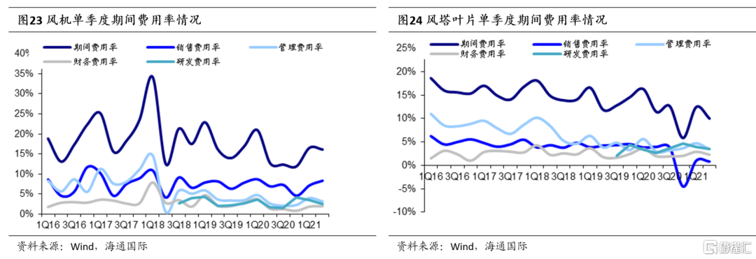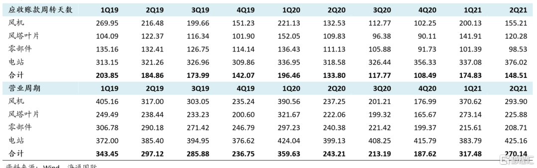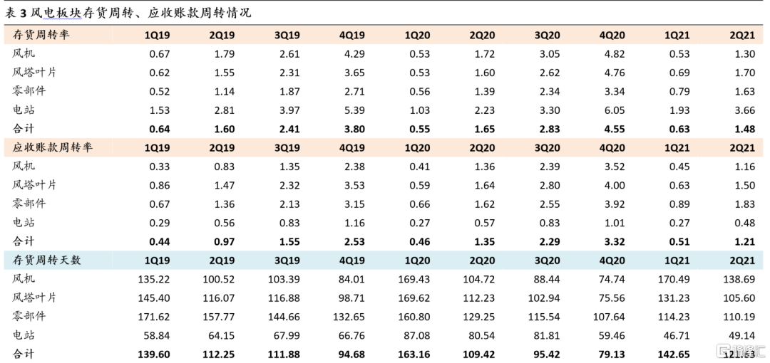 分子板块来看,21Q2期间费用率最高的是电站板块,达到21.98%,主要是财务费用率明显高于其他子板块,风机、风塔叶片、零部件三大子板块21Q2期间费用率分别为16.06%、10.05%、8.71%,其中风塔叶片板块的期间费用率同环比有一定下降。