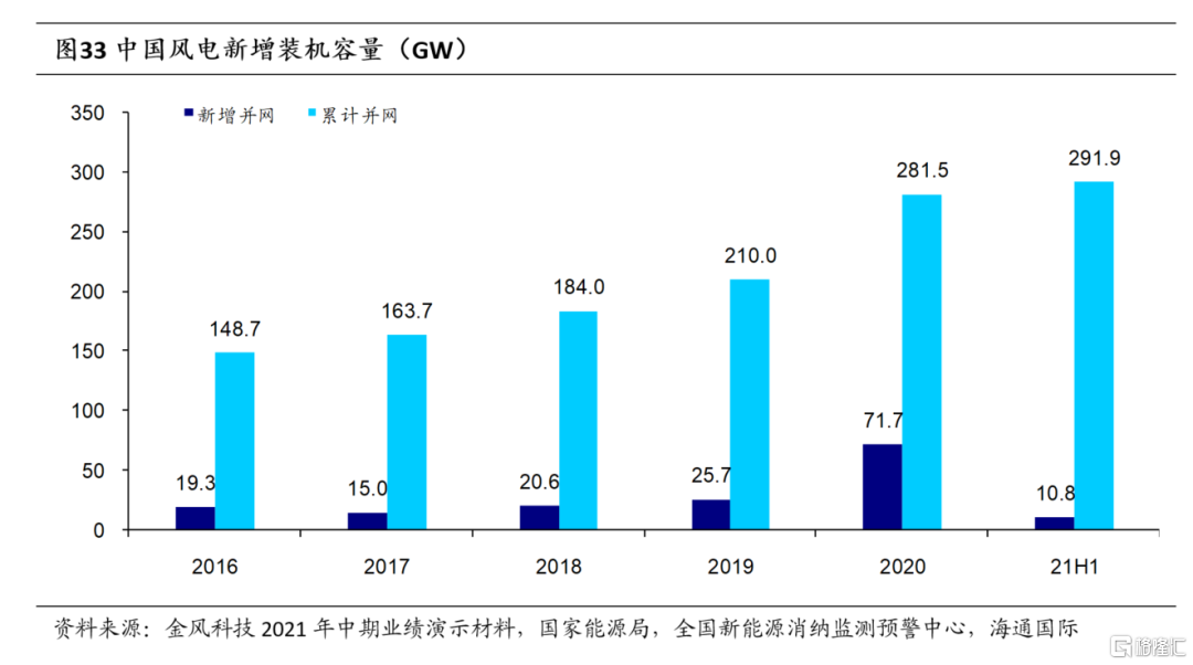 另根据中电联《2021年上半年全国电力供需形势分析预测报告》,预计到2021年底,并网风电容量将达3.3亿KW,约合330GW,相比2020年底281.5GW有接近50GW左右的新增容量,扣除上半年新增并网10.8GW,我们预计下半年新增风电并网容量有望达到35-40GW左右。