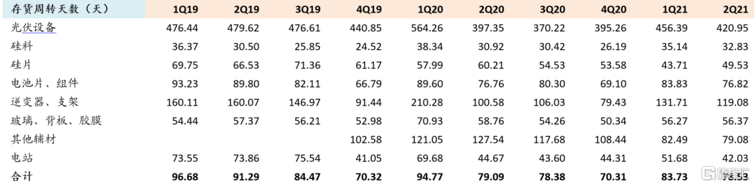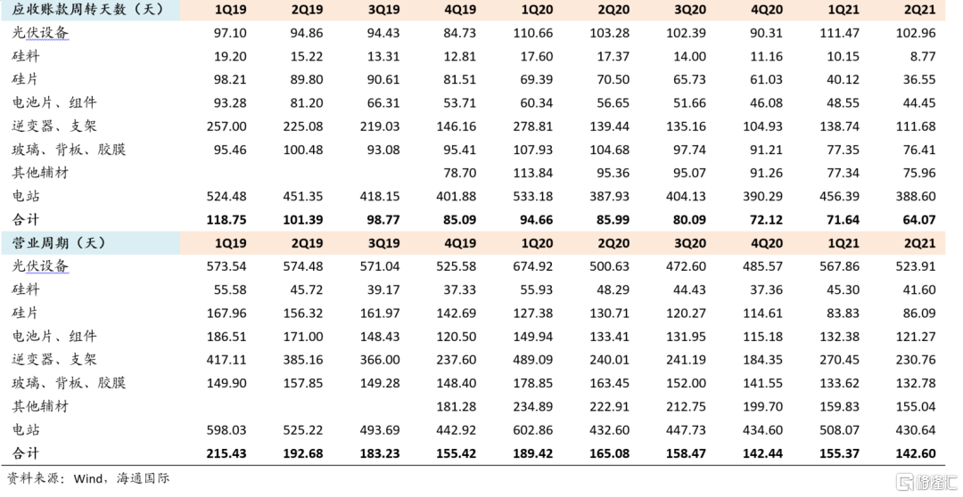 光伏行业2021年上半年营业周期为142.60天,相比2020年上半年165.08天有明显下降;其中存货、应收账款周转天数分别为78.53天、64.07天;分板块看,光伏设备运营周期最长,硅料营运周期最短。
