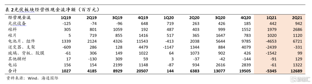 2021年Q2单季度,光伏行业整体经营性现金流净额达126.69亿元,相比20Q2的63.83亿元同比接近翻倍;8个子板块21Q2的经营性现金流净额环比均有增长,除逆变器、支架及玻璃、背板、胶膜板块同比下滑较大之外,其他板块同比均有大幅增长;