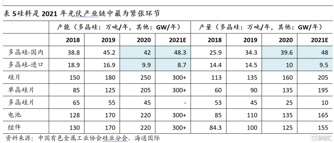 产业链上下游匹配角度:根据上表中硅业分会的产能统计,2021年下游硅片、电池、组件等各环节产能均超过300GW,产能明显更加充足;而多晶硅环节则是最为紧张的环节,根据上表中硅业分会预计,2021年国内产量48万吨,海外进口9.5万吨,在产能利用率非常高的情况下,对应可满足约205GW的硅片生产量,我们认为在此上下游匹配程度下,多晶硅或将成为2021年产业链生产中的瓶颈环节。