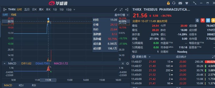 华盛资讯10月7日讯,生物制药公司Theseus Pharmaceuticals(THRX.O)首日上市开涨超50%,现涨幅回落至34.75%,报21.56美元。