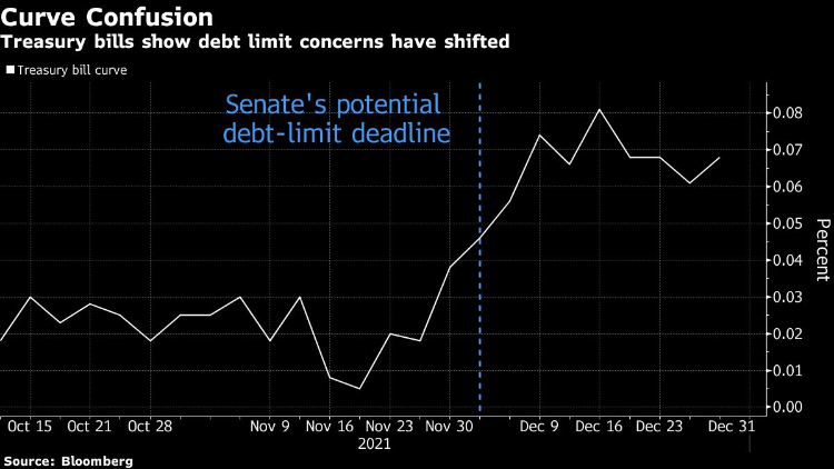 在两党达成短暂提高债务上限协议前,10月21日到期国债收益率一度急升,并达到过0.1325%,而这个到期日前后到期的多数国债收益率报0.05%或更低。