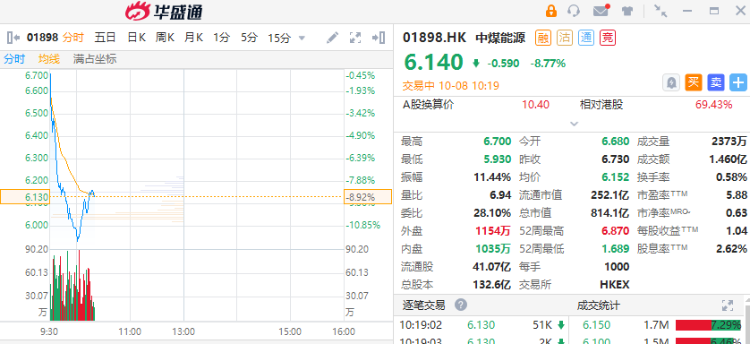 华盛资讯10月8日消息,港股电力、煤炭股集体大跌,中煤能源、兖州煤业跌超8%,中国电力、华润电力跌超8%,中广核电力、大唐发电跌超7%。