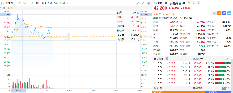 今日早盘,开拓药业一度涨超8%,现涨1.56%,报42.20港元。