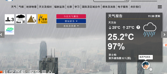 据香港天文台:上午11时45分改发黑色暴雨警告信号。在狮子山与东北季候风共同影响下,华南沿岸普遍吹强风,离岸及高地间中吹烈风。三号强风信号会在今日下午至今晚晚间维持。