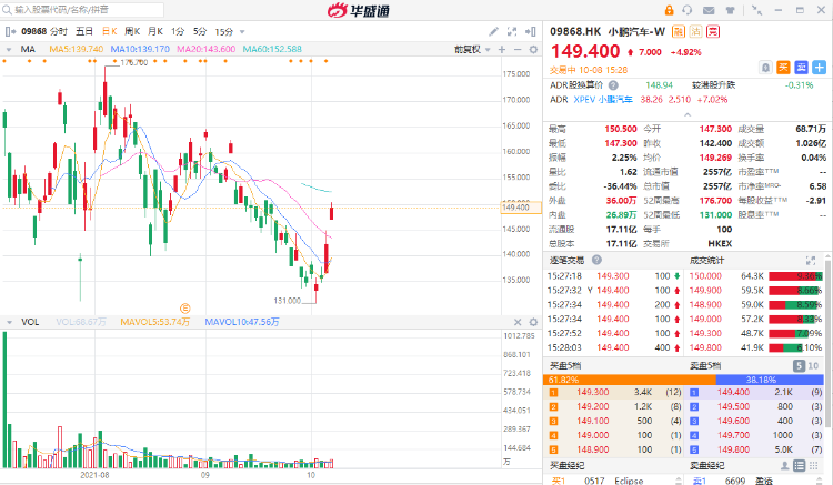 华盛资讯10月8日消息,小鹏汽车-W今日跳空高开,现涨4.92%,3日累计反弹超10%。报149.4港元,总市值为2557亿港元。