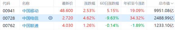 格隆汇10月8日丨三大电信股全线上涨,中国电信涨超4%,中国移动涨超2%,中国联通涨超1%。