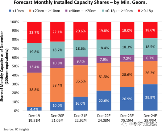 按照IC Insights的统计和预测,各种半导体制程的市占率正向着相对更加均衡的方向发展,如下图所示。