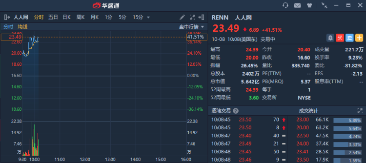 华盛资讯10月8日讯,热门中概股集体走高,截至发稿,人人网 $RENN 涨超41%,斗鱼 $DOYU 、爱奇艺 $IQ 涨超4%,滴滴 $DIDI 涨近4%,唯品会 $VIPS 、阿里巴巴 $BABA 涨近3%,百度 $BIDU 涨超2%,京东 $JD 、哔哩哔哩 $BILI 涨超1%。