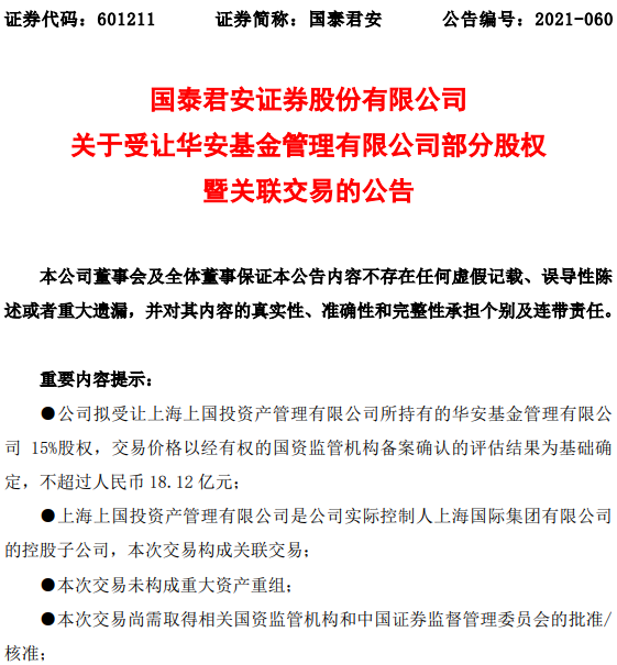 10月8日晚间,国泰君安发布公告称,公司拟受让上海上国投资产管理有限公司(下称“上国投资管”)所持有的华安基金15%股权。本次交易价格,以经有权的国资监管机构备案确认的评估结果为基础确定,不超过人民币18.12亿元。