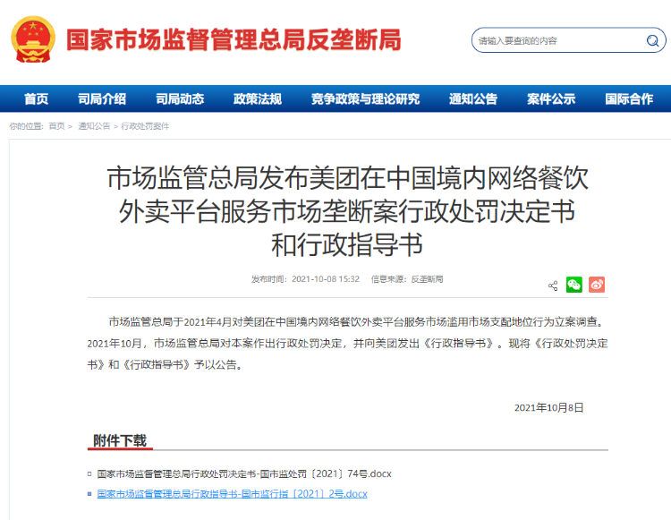 10 月 8 日下午,市监总局在其官网公布了一则行政处罚,称美团滥用其在餐饮外卖平台服务市场的支配地位,采取多种手段实施“二选一”行为,违法了《反垄断法》。