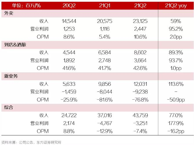 分板块来看,外卖、到店酒旅和新业务收入在21Q2均实现同比大幅增长,业绩超预期。21Q2外卖收入231.3亿元,同比提升59%,环比升高12.4%;到店酒旅收入86亿元,占总收入的19.7%,同比增长89.3%,环比增长30.6%,2年CAGR为28.1%。餐饮外卖和到店酒旅业务Q2保持高增长,营业利润61亿元,较2020年同期31亿元有所增长。