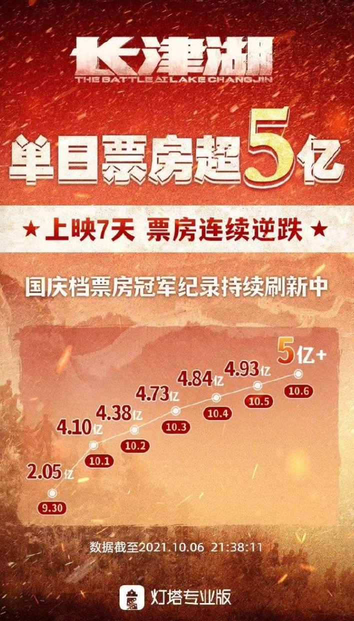 这当中,抗美援朝题材的战争大片《长津湖》七天拿下了32亿,一家就分走了国庆档七成以上的票房。影片截至10月8日票房已经突破35亿,最终票房大概率将挺进中国影史前三,甚至有望向《战狼2》的56亿发起冲击。