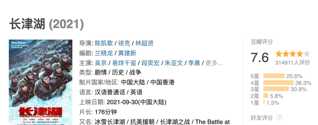 因为停拍、赶期、多位导演分头创作等等因素,《长津湖》并非十全十美,在特效、剪辑方面出现了不少瑕疵。国庆档结束,影片豆瓣评分稳定在7.6,稍好于去年的《八佰》。