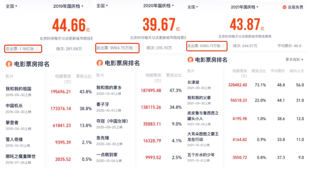 事实证明,疫情时代的院线电影市场,不存在差异化竞争这件事。光是冠亚军两部大片,就分走了今年国庆档95%的票房。相比今年春节档,分化更为严重。