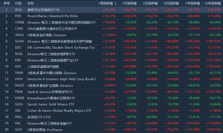 再来看ETF涨幅榜:做多中概股、原油和黄金的ETF涨幅居前。