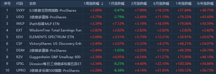 股指方面,本周恐慌指数ETF表现突出。其中,0.5倍做空恐慌指数ETF $SVXY 涨幅居前,一周累计涨3.88%。此外,3倍做多道指ETF $UDOW 一周累计涨3.75%。