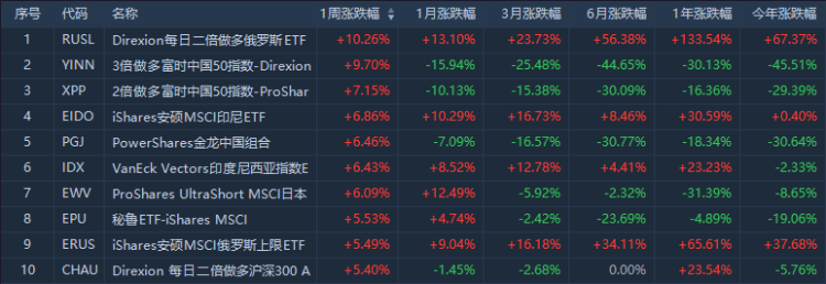 区域ETF中,每日2倍做多俄罗斯ETF $RUSL 本周上涨10.26%,近一年涨幅达133%。接着表现靠前的是3倍做多富时中国50指数ETF $YINN ,周涨9.7%,该ETF目前的近半年成绩为下跌44.65%。