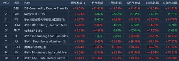 本周实体钯ETF $PALL 、iPath彭博镍分类指数总回报ETN $JJN 位居商品ETF涨幅前位,本周分别上涨7.74%、6.77%。