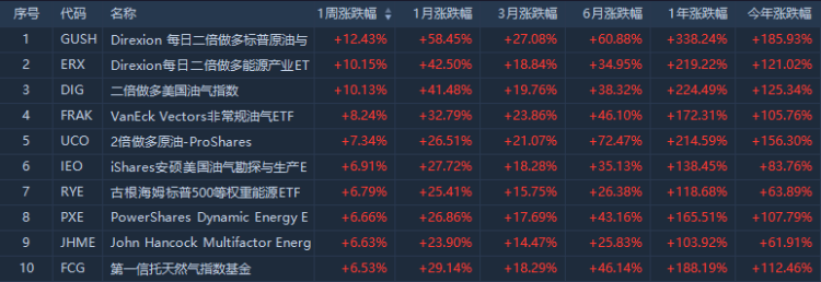 能源ETF方面,每日二倍做多标普原油和天然气探勘与开采产业ETF $GUSH 周涨12.43%,近一年已涨近340%。
