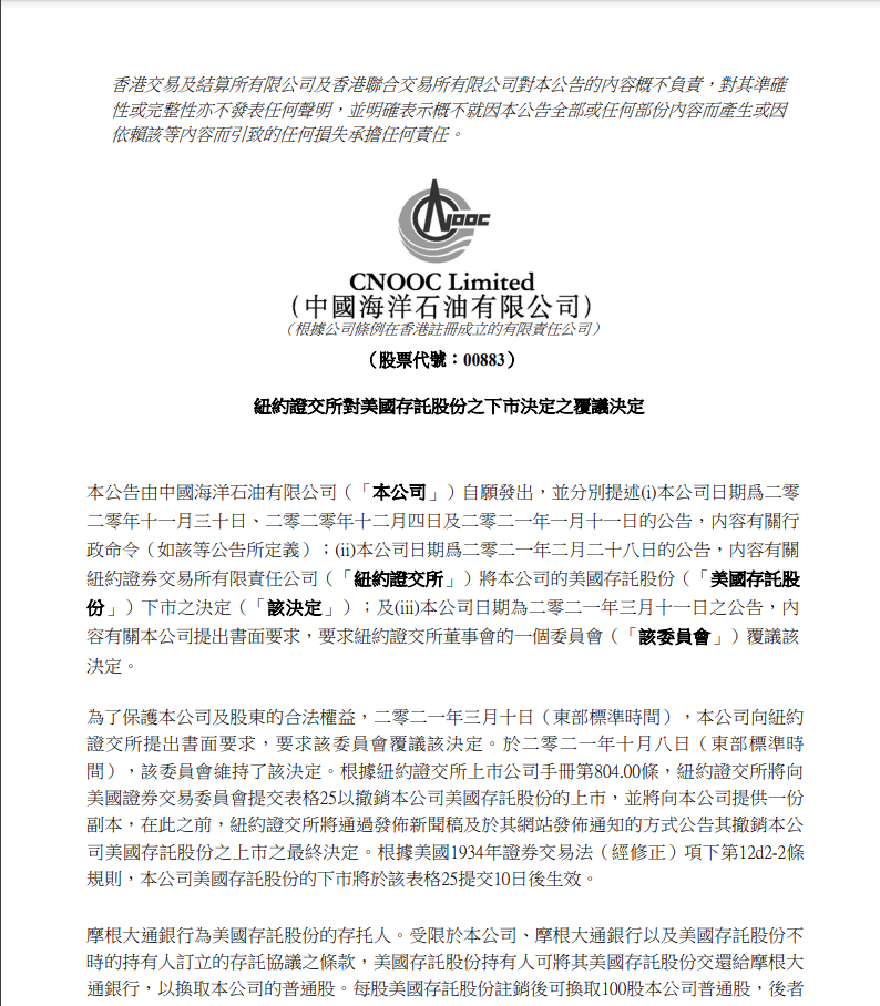 10月10日,中国海洋石油(00883,HK)公告称,有关纽约证交所将公司的美国存托股份下市的决定,为了保护公司及股东的合法权益,2021年3月10日(东部标准时间),公司向纽约证交所提出书面要求,要求该委员会复议该决定。于2021年10月8日(东部标准时间),该委员会维持了该决定。