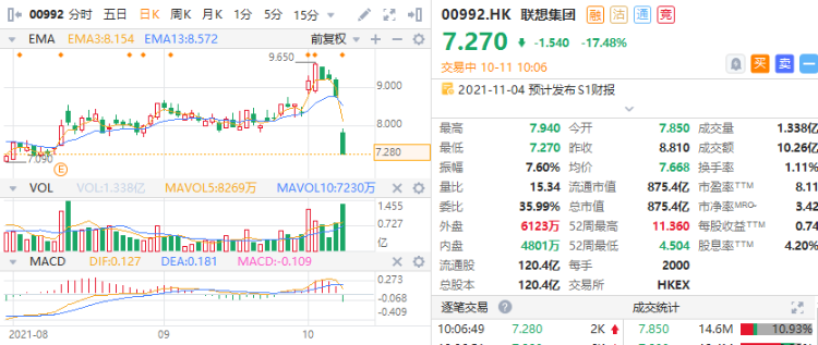 华盛资讯10月11日消息,联想集团跌幅扩大至17%,联想控股大跌11.8%。