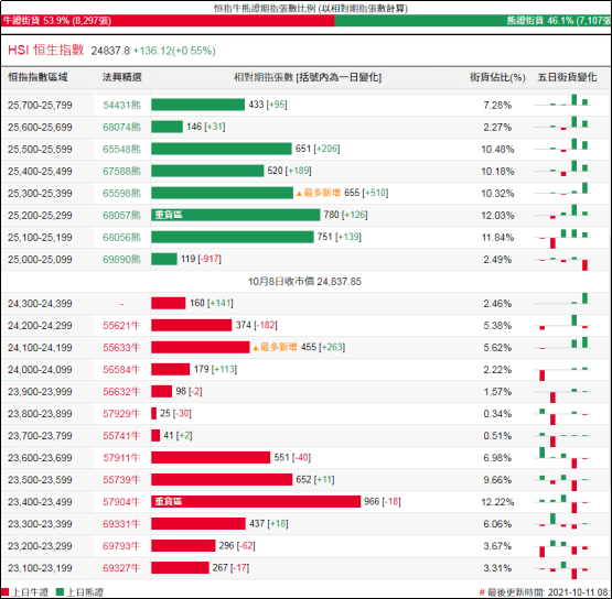 街货分布方面,至上周五,恒指牛证街货重货区在收回价23300点至23700点之间,累计相当约2,606张期指合约;恒指熊证街货重货区在收回价25000点至25400点之间,累计相当约2,305张期指合约。