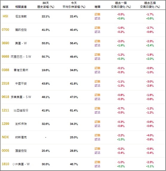 上周五恒指相关权证的平均引伸波幅约22.4%,按日略有下降。个股方面,腾讯、港交所、平安、京东、比迪、友邦、汇丰等相关认购证及认沽证的引申波幅均按日有所调降;相反,美团、纳斯达克、小米等相关认沽证的引申波幅则按日有所调升。