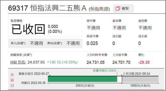2、看错方向:恒指法兴二五熊(69317.HK),上周五被强制收回。
