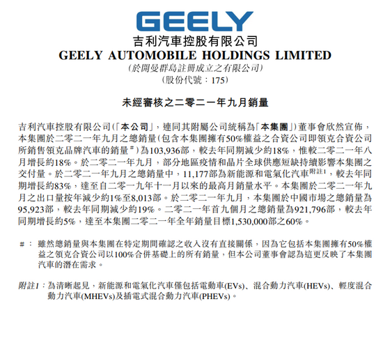吉利汽车:于二零二一年九月之总销量(包含本集团拥有50%权益之合资公司即领克合资公司所销售领克品牌汽车的销量)为103,936部,较去年同期减少约18%,惟较二零二一年八月增长约18%。