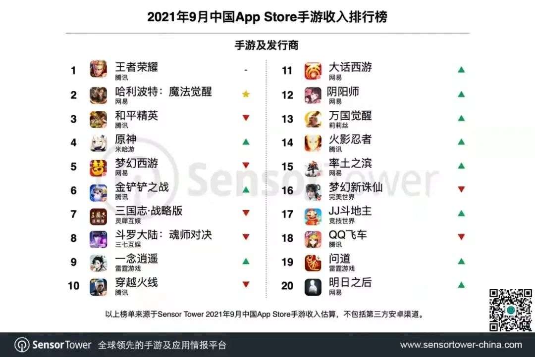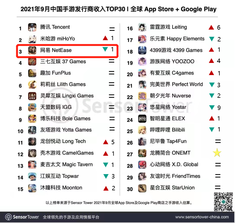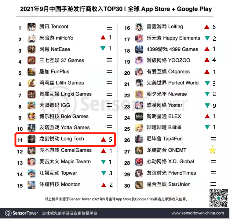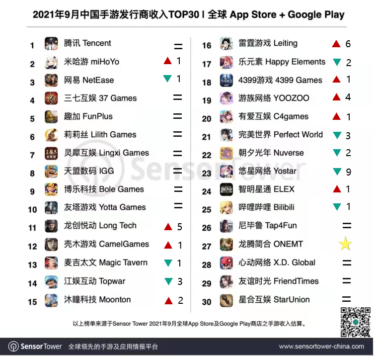 近日,SensorTower发布了2021年9月中国手游发行商在全球App Store & Google Play的收入排名。(仅统计发行商收入,且不包括中国地区第三方安卓渠道)