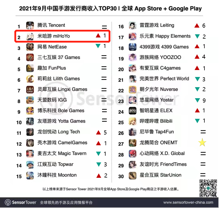 随着9月《原神》1周年庆典的到来,米哈游收入环比增长121.8%,相当于去年同期的近10倍,再创新高,重回全球手游发行商收入榜第2名。